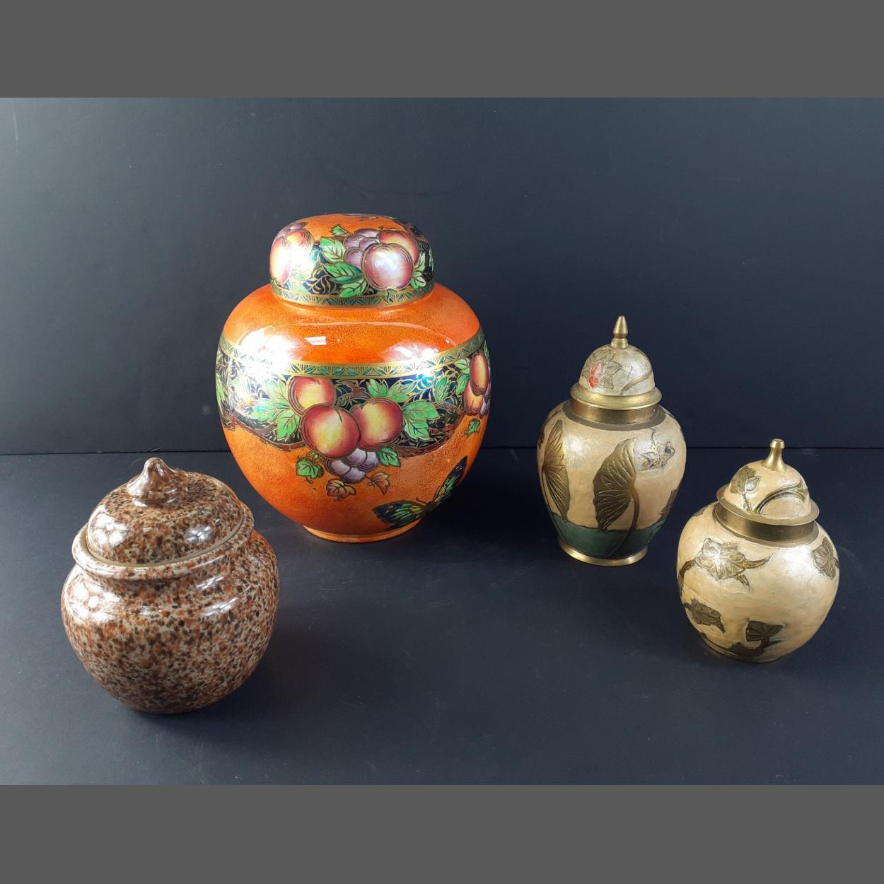A NEWHALL BOUMIERWARE Lucien Bouthmier ginger jar with lid with a vibrant orange lustre glaze, stands 21cm approx, (crack in lid) with two enamelled brass ginger jars 16 and 13cm tall approx and also a mottled brown ginger jar 13cm high