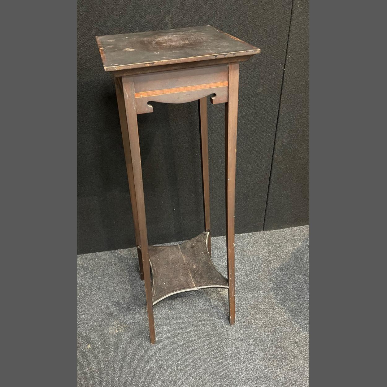 A tall ANTIQUE plant-stand with lower shelf...the table is split and requires a light repair - height 90cm x 30cm square top approx