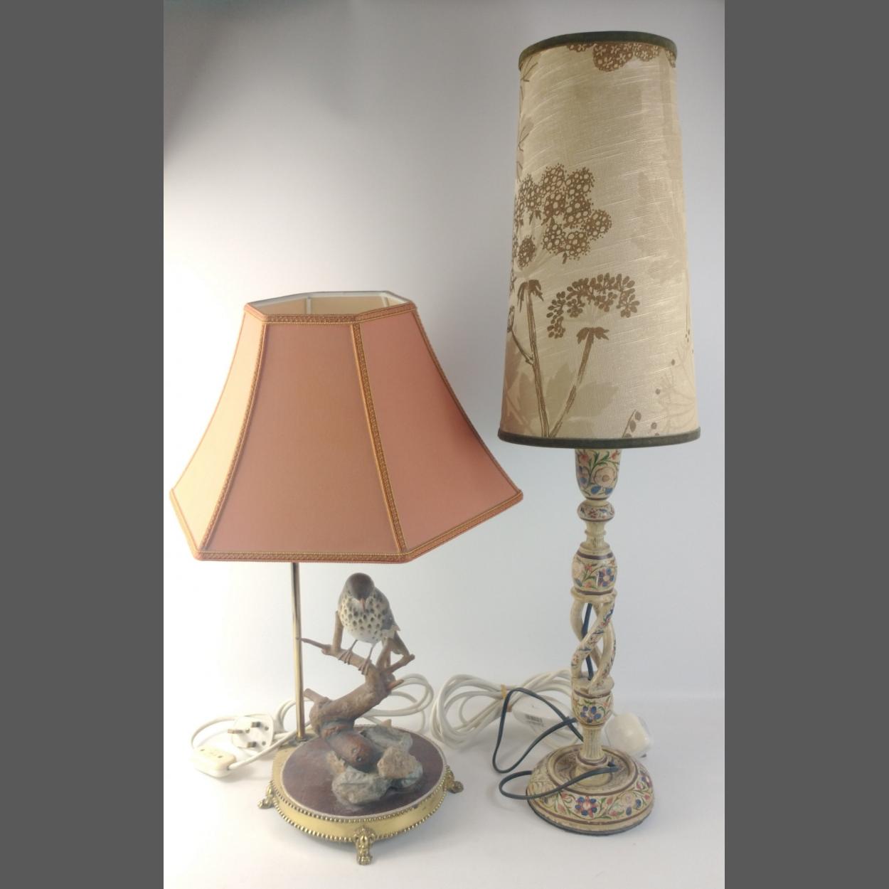 Two interesting table lamps. One with a well modelled ceramic Thrush on the base the other with rustic country style hand painted base.