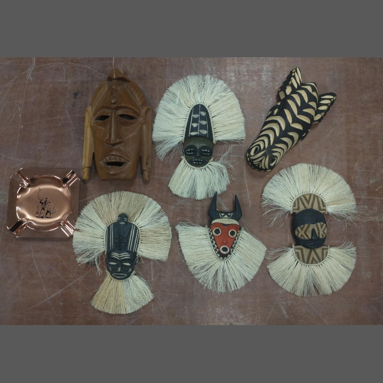 A small collection of AFRICAN tribal masks to include an Ancestor, Luvali, Bahila, a Sungod plus a wooden face 20cm approx and a lightweight wooden zebra face approx 18cm plus an unused copper ashtray from Zimbabwe