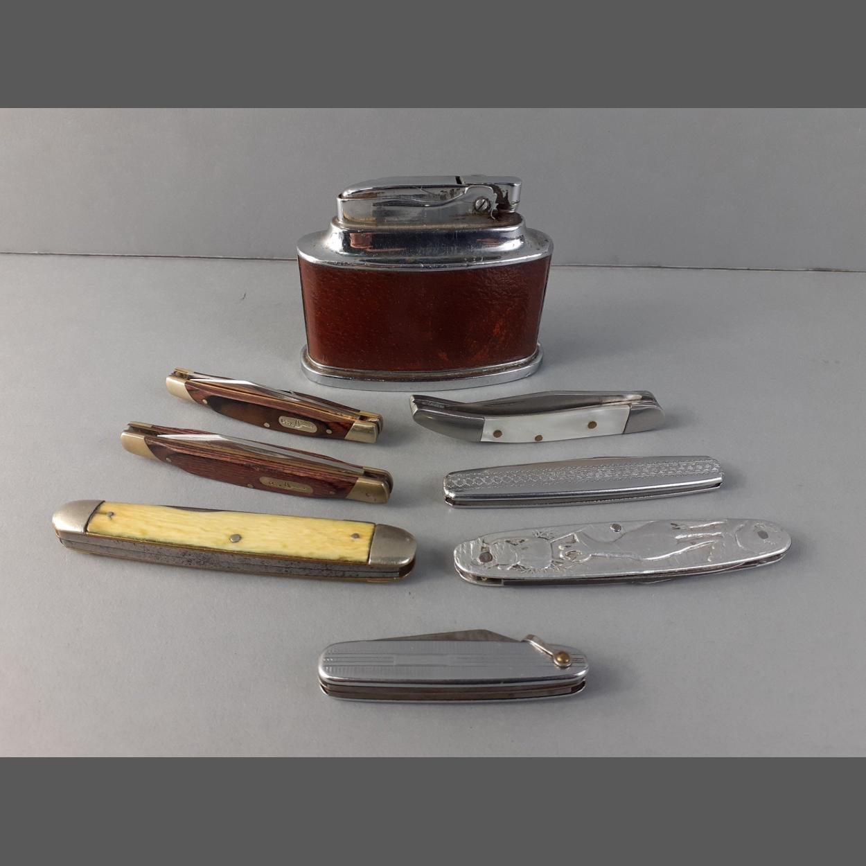 A great lot of seven assorted pen / fruit knives in good order and a RONSON SENATOR table lighter in nice condition, not currently working.