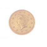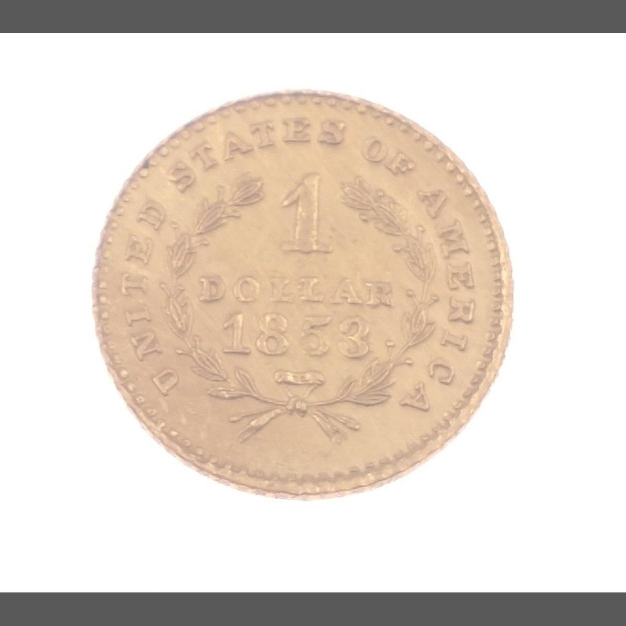 A small yellow metal coin marked 1 DOLLAR 1853. Measures 14mm approx and weighs 1.44g approx