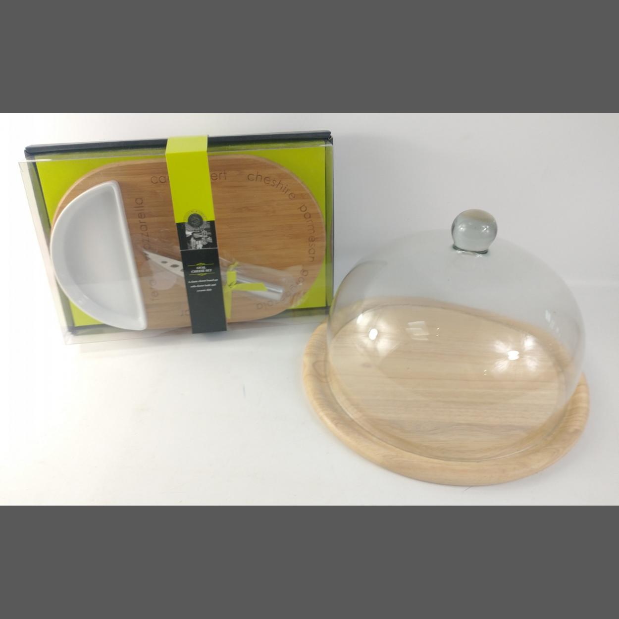 A WILLIAMS & GREEN unopened oval cheese set comprising a cheese board with cheese knife and ceramic dish, plus a multi-function glass domed round display board for cakes or cheese, base 30cm approx and standing approx 22cm high