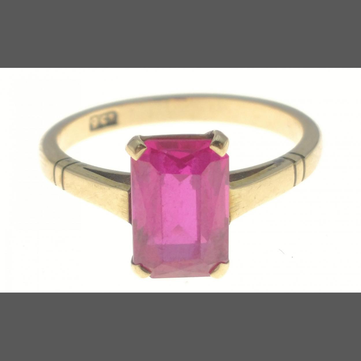A 9ct stamped ring set with single red/pink stone, gross weight 2.6g approx, size N. Stone dimensions 8mm x 5mm
