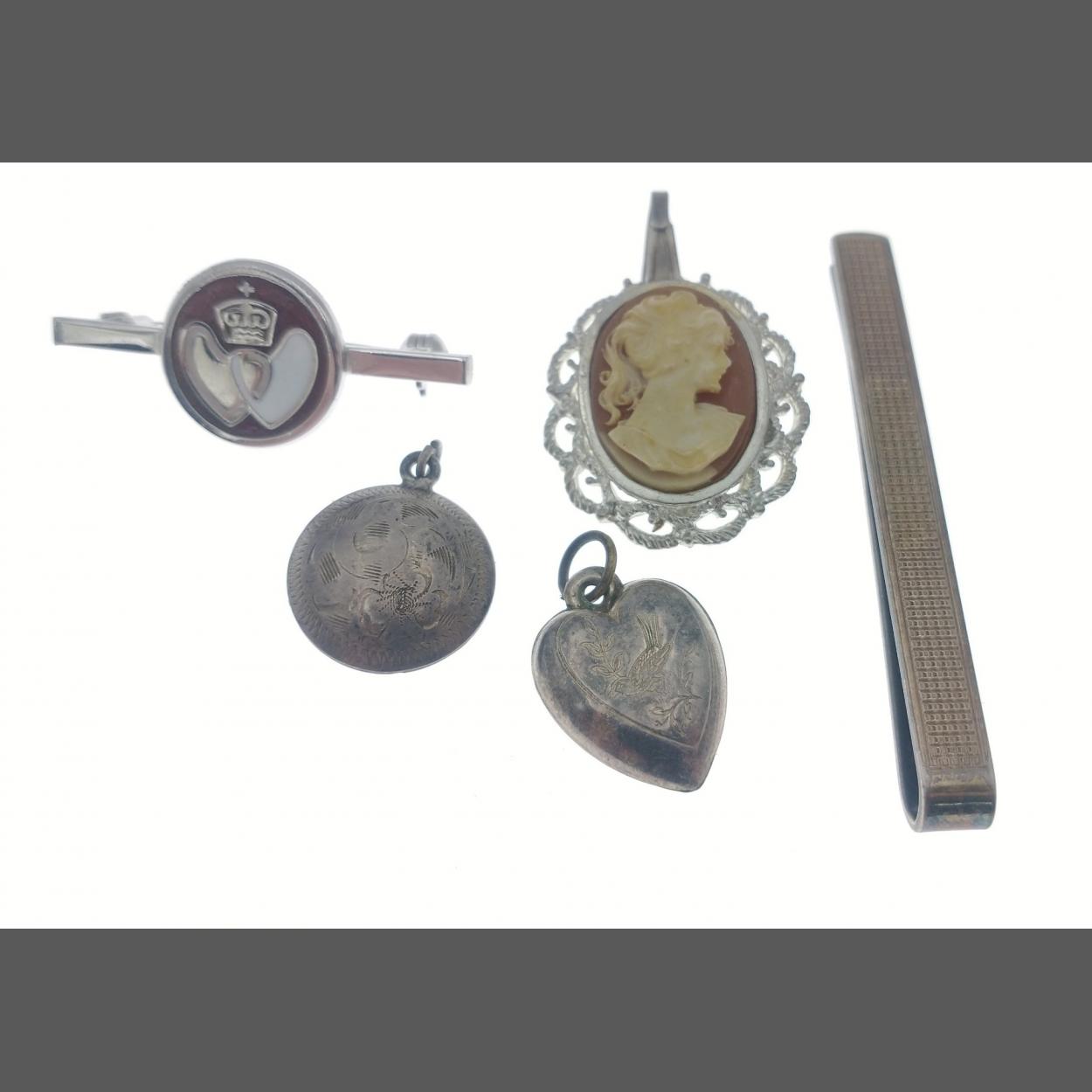 A small selection of vintage jewellery to include 2 silver lockets, (combined gross weight 3g approx), and a small European cameo pendant (32mm including the suspension) stamped 824 to the rear, gross weight 5g approx and a tie-clip (55mm approx) marked 9ct gold on silver and a single unmarked yellow metal stud and another small pin badge