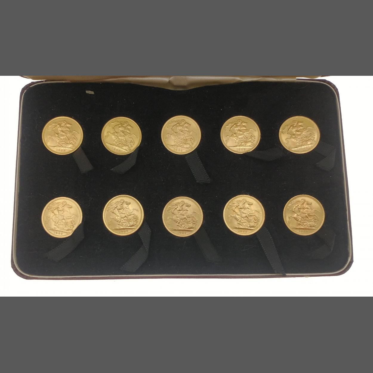 A fine collection of 10 Elizabeth II full sovereigns offered in a red leather 10 coin presentation case, coins dated 1962, 1963, 1964, 1965, 4 x 1966, 1967 and 1968 IF THIS LOT IS UNSOLD THESE SOVEREIGNS WILL BE OFFERED INDIVIDUALLY.
