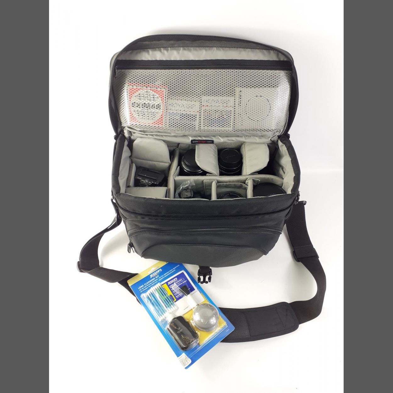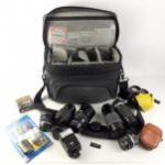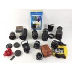 A padded LOWEPRO camera bag full of camera lenses to include a SIGMA zoom 1:4-5.6 f=28-200mm, a VIVITAR 80-200mm 1:4.5 MC zoom no 28104042, a HOYA 52mm Skylight [1B], a TOKINA SD 70-120MM 1:4-5.6, a VIVITAR MC tele-converter 2x-21, an OLYMPUS OM-SYSTEM G.ZUIKO auto-S 1:1.4 f=50mm no 395297, an OLYMPUS OM-SYSTEM G.ZUIKO auto-S 1:1.8 f=50mm no 1492602, a NIKKOR 50mm 1:1.8 no 3236439 plus flash guns, filters etc