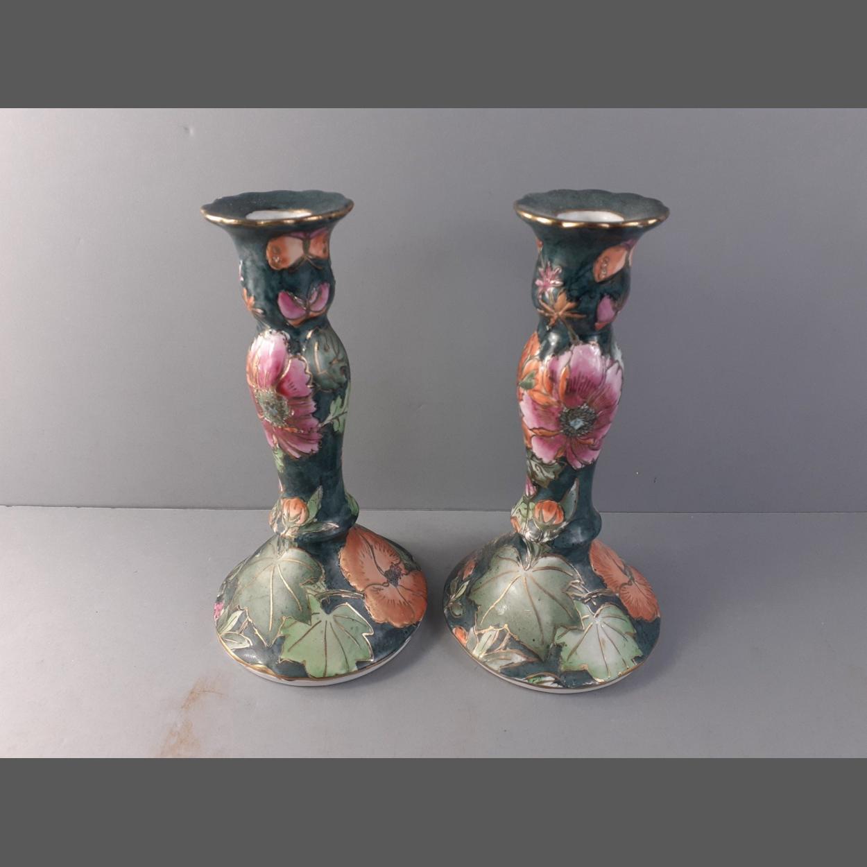 A pair of H.F.P. MACAU porcelain candlesticks with gilt highlights, each stands approx 12cm high