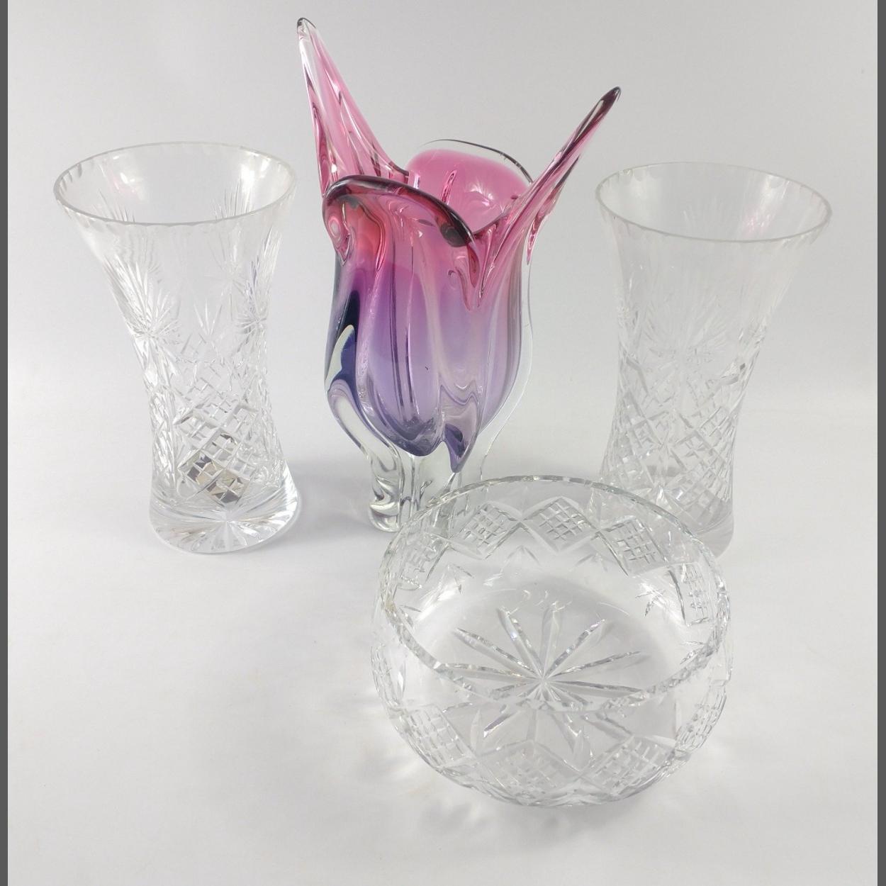 A pair of first quality EDINBURGH CRYSTAL vases each 25cm tall, no damage, also a cranberry heavyweight glass vase standing 33cm high and a crystal fruit bowl 19cm dia.