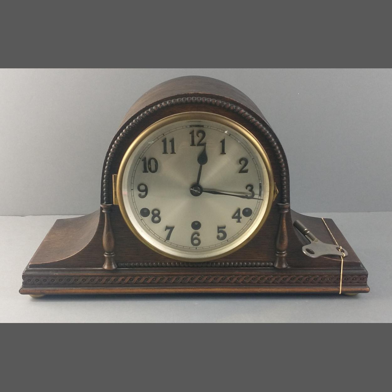 A Napoleon-shaped wooden mantle clock with key measuring approx. 37cm in length by 22cm in height.