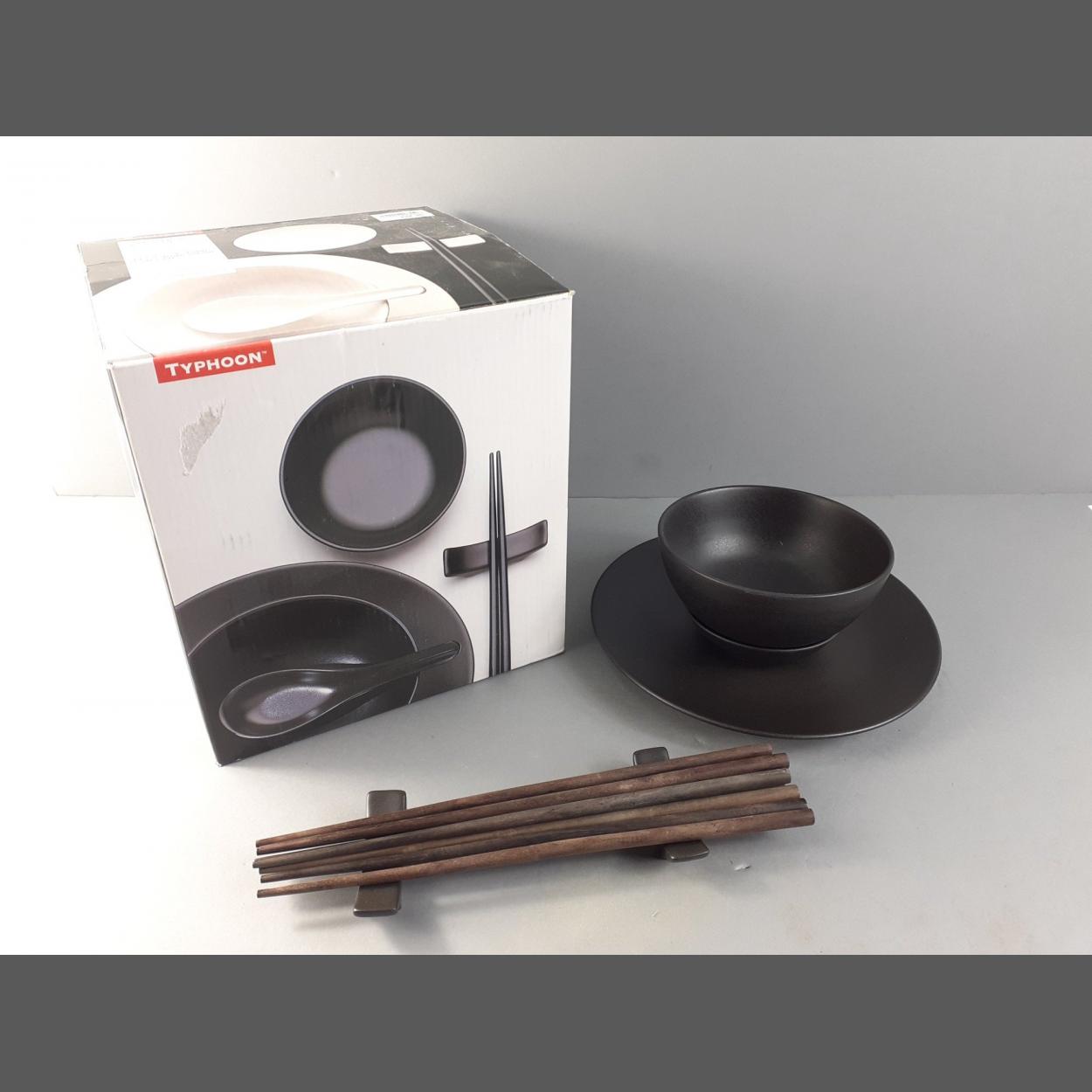 A black TYPHOON boxed Chinese dinner service for four comprising 4 each of dinner plates, rice bowls, spoon, sauce dish, pairs of chopsticks and chopstick rests. Purchased from Jenners