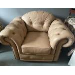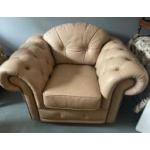 A NICE QUALITY DEEP BUTTONED three piece suite in light brown/beige to include a three piece sofa and two armchairs - they are all in great condition with the sofa being almost 'never sat on'!