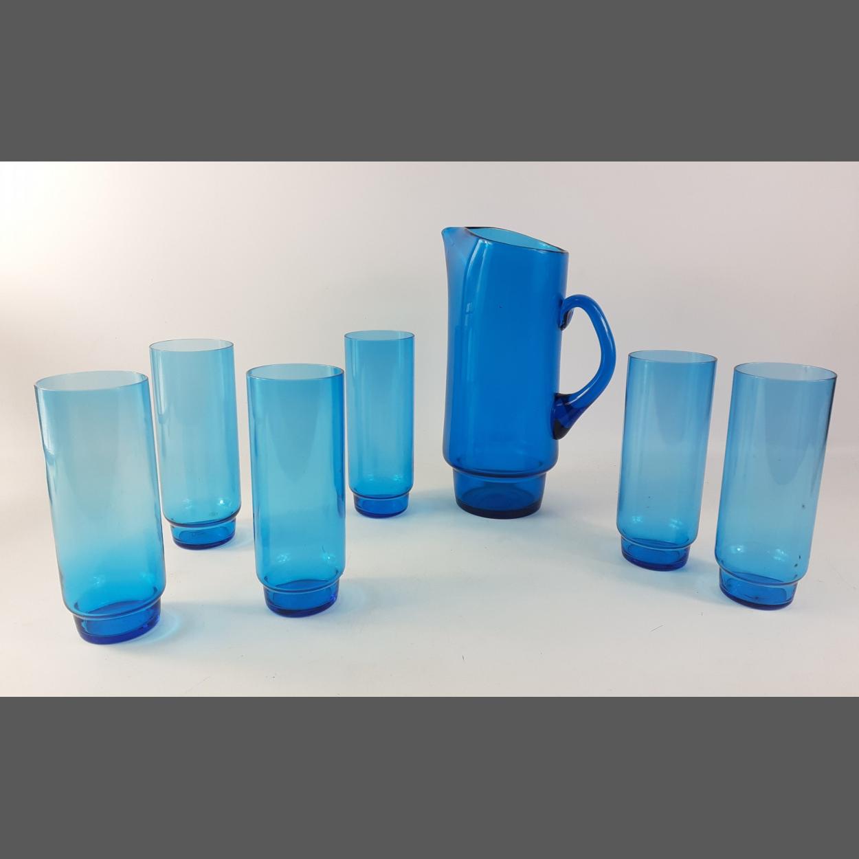 A blue glass water set consisting of 6 hi-ball glasses and a large jug standing 25cm high. No damage