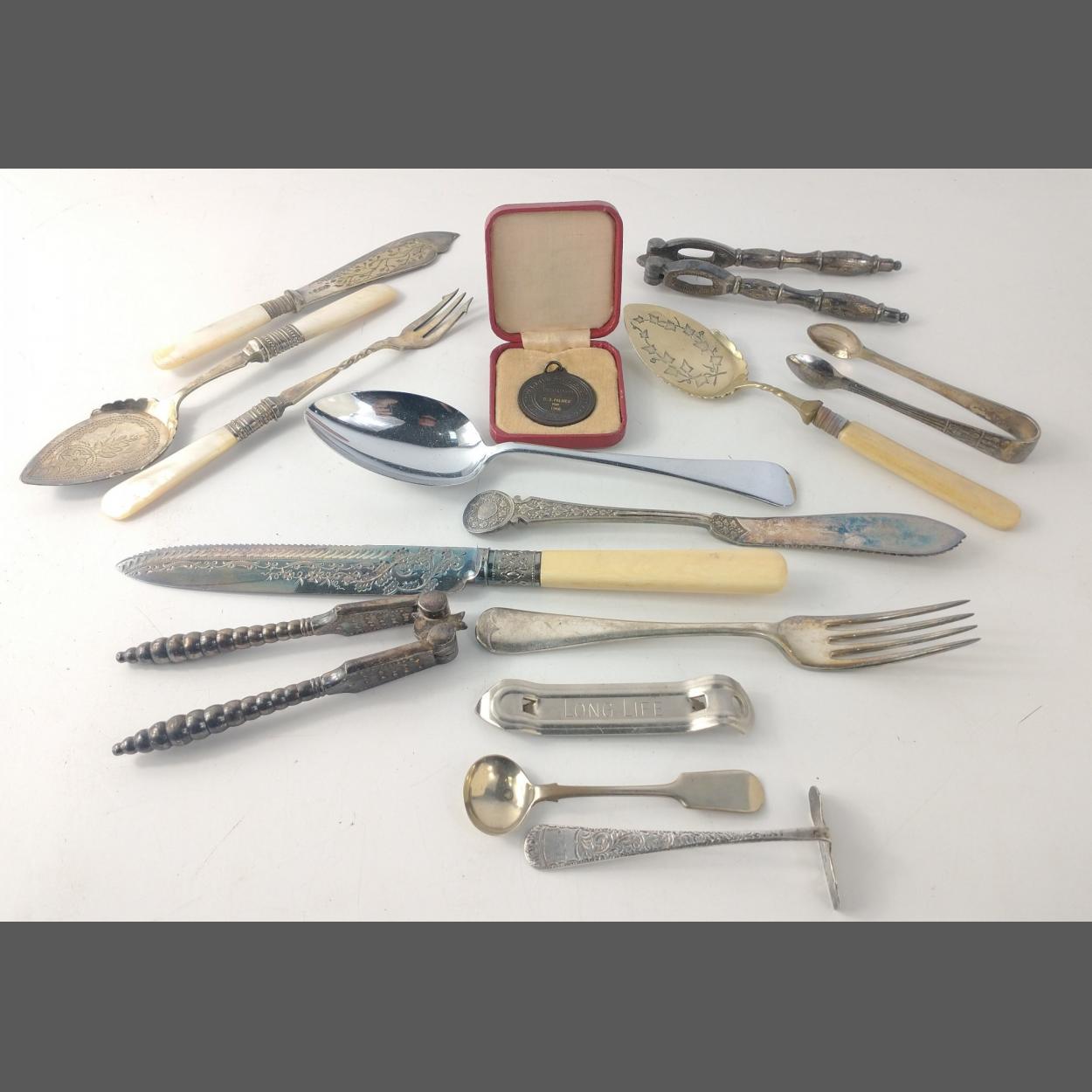 A small quantity of white metal cutlery to include sugar snips, petit fours servers, etc plus a silver hallmarked Birmingham 1928 baby pusher, 10cm long weight 16.28g approx