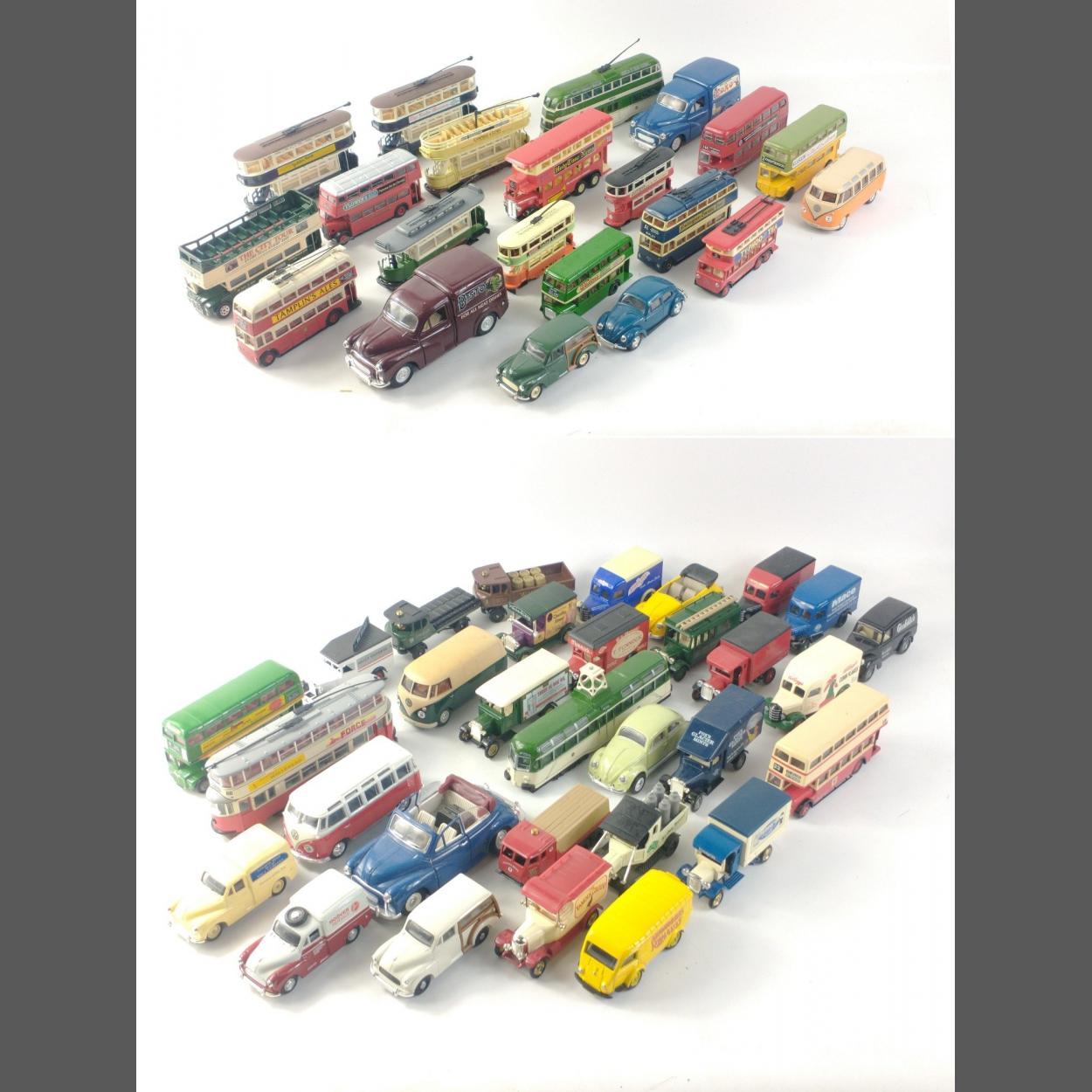 A box of Diecast models to include many CORGI buses and trams as well as some Lledo models.
