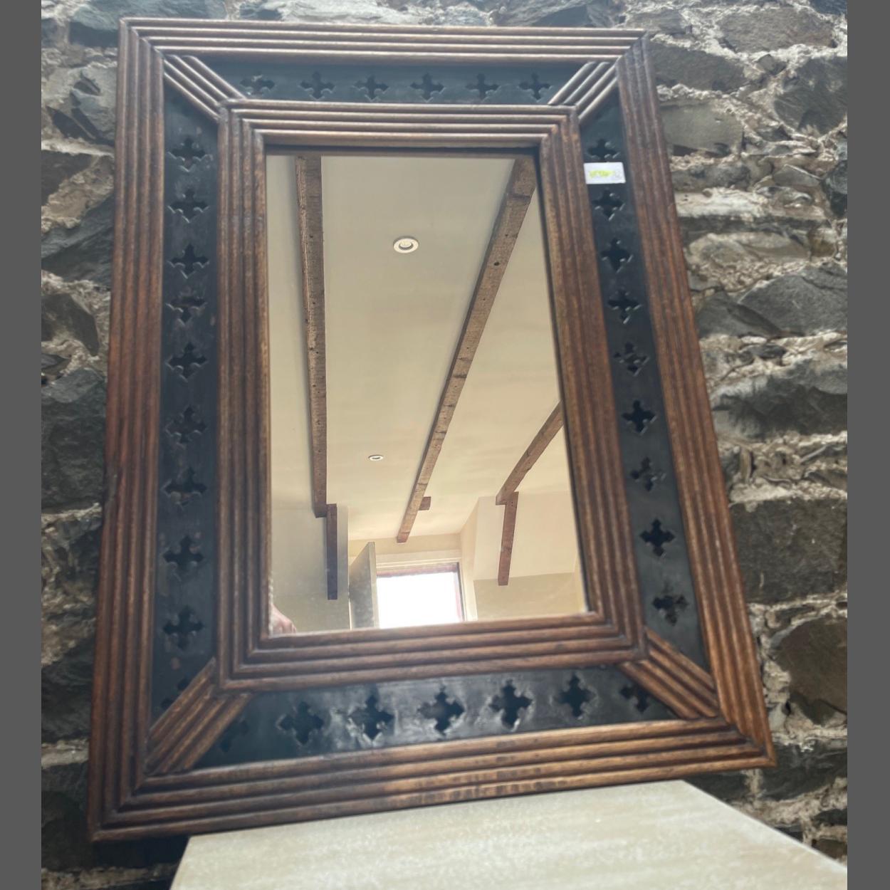 An UNUSUAL rectangular wall mirror with black metal fretwork design - dimensions 50cm x 70cm approx