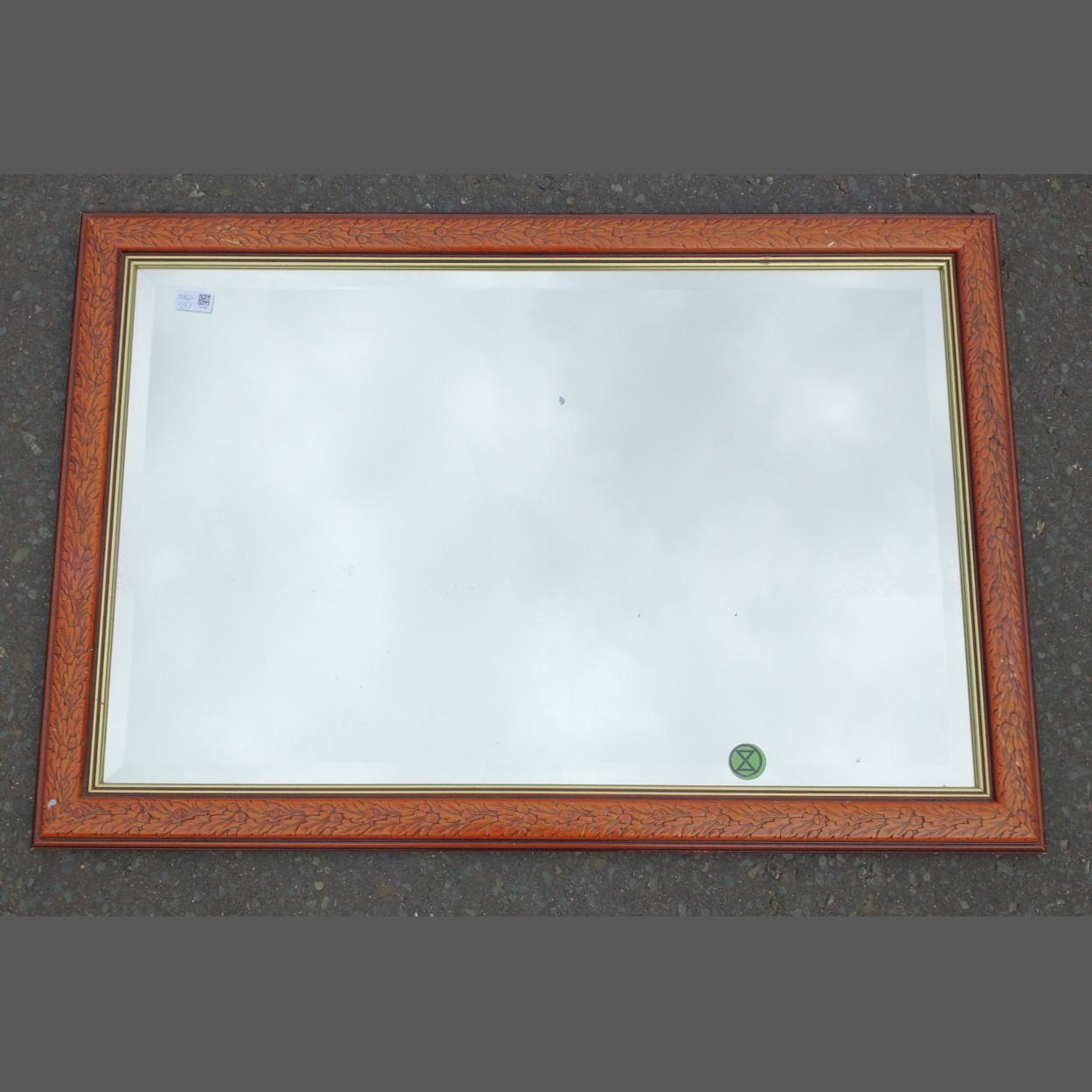 A large bevelled mirror with carved wooden frame, measures 95 x 65cm approx