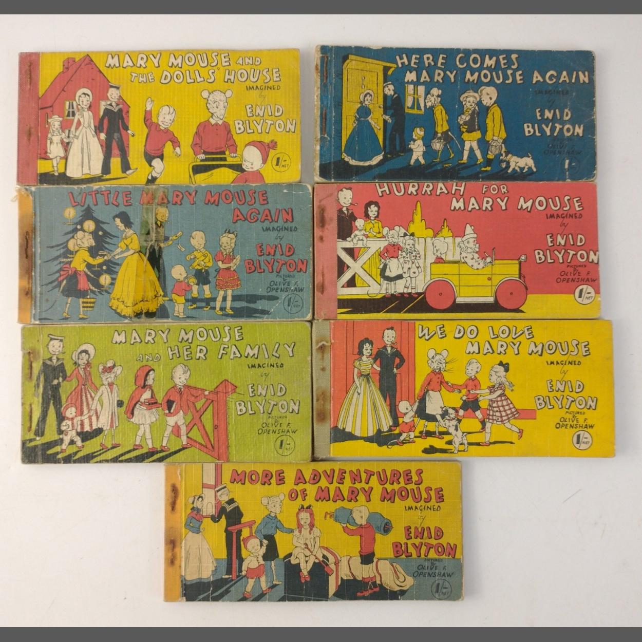 A collection of seven ENID BLYTON imagined MARY MOUSE comics pictured by OLIVE F OPENSHAW published in the mid-20th century by Brockhampton Press children's books including Mary Mouse and the Dolls' House, Little Mary Mouse Again, Mary Mouse and Her Family, Here Comes Mary Mouse Again, Hurrah for Mary Mouse, We Do Love Mary Mouse and More Adventures of Mary Mouse