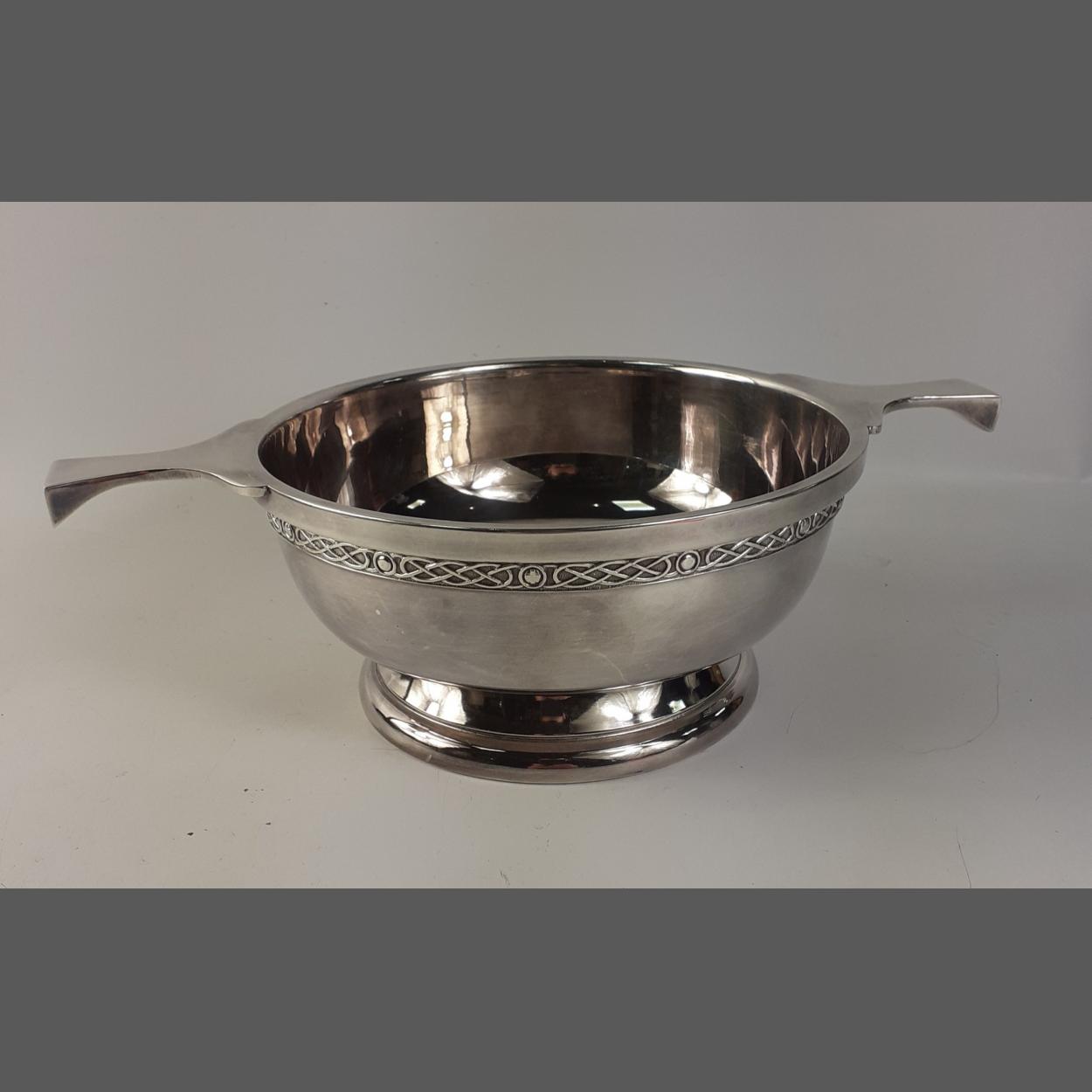 A substantial and impressive large Scottish silver plated QUAICH measuring 18cm excluding handles and weighing 568g. Gorgeous Celtic design around the rim. A lovely example.