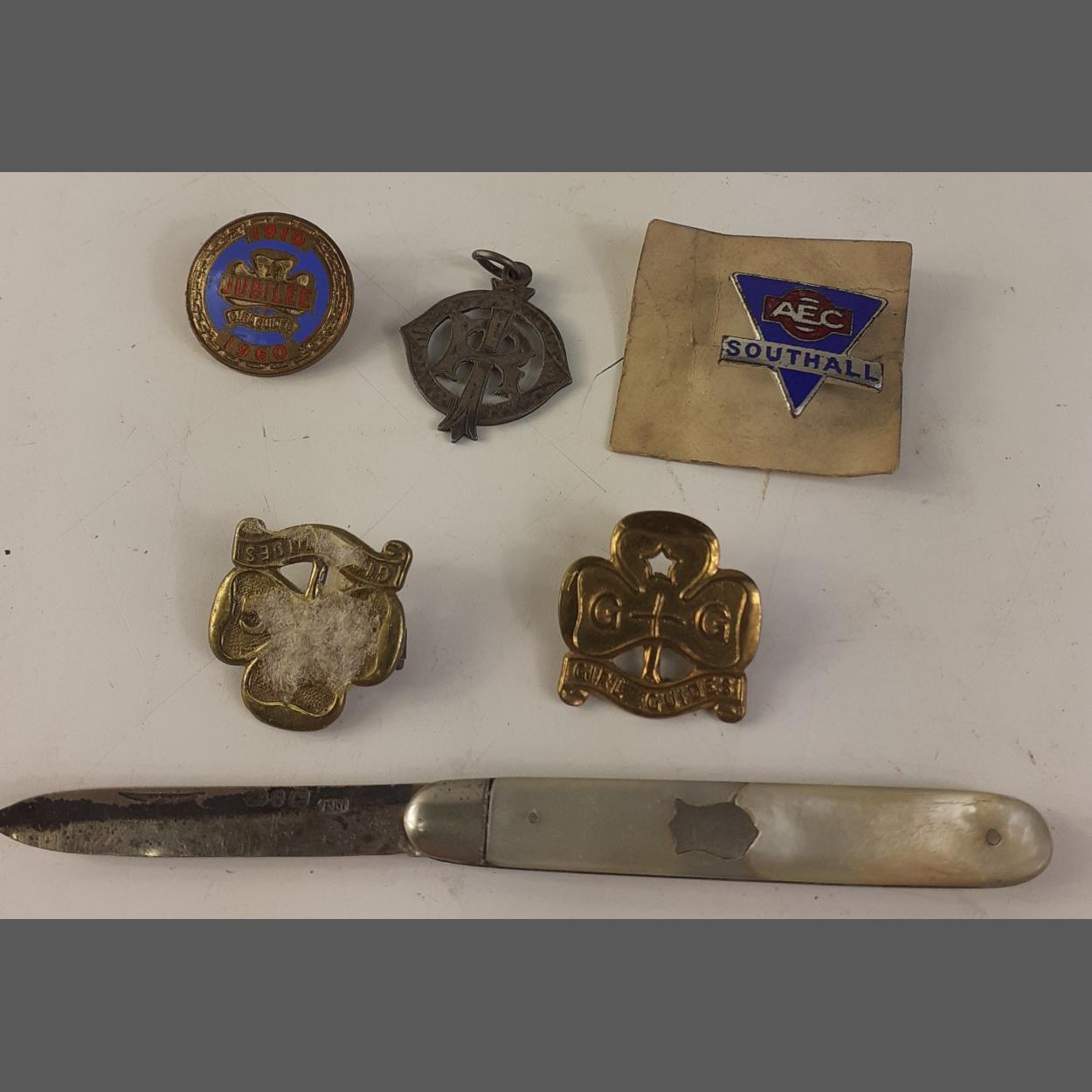 A mixed collection of lapel badges to include a hallmarked silver pendant, GIRL GUIDES badges x 2 by Collins of London and a 1910/1960 Girl Guides Jubilee badge and a SOUTHALL pin badge with a HALLMARKED SILVER pen 'fruit-knife'