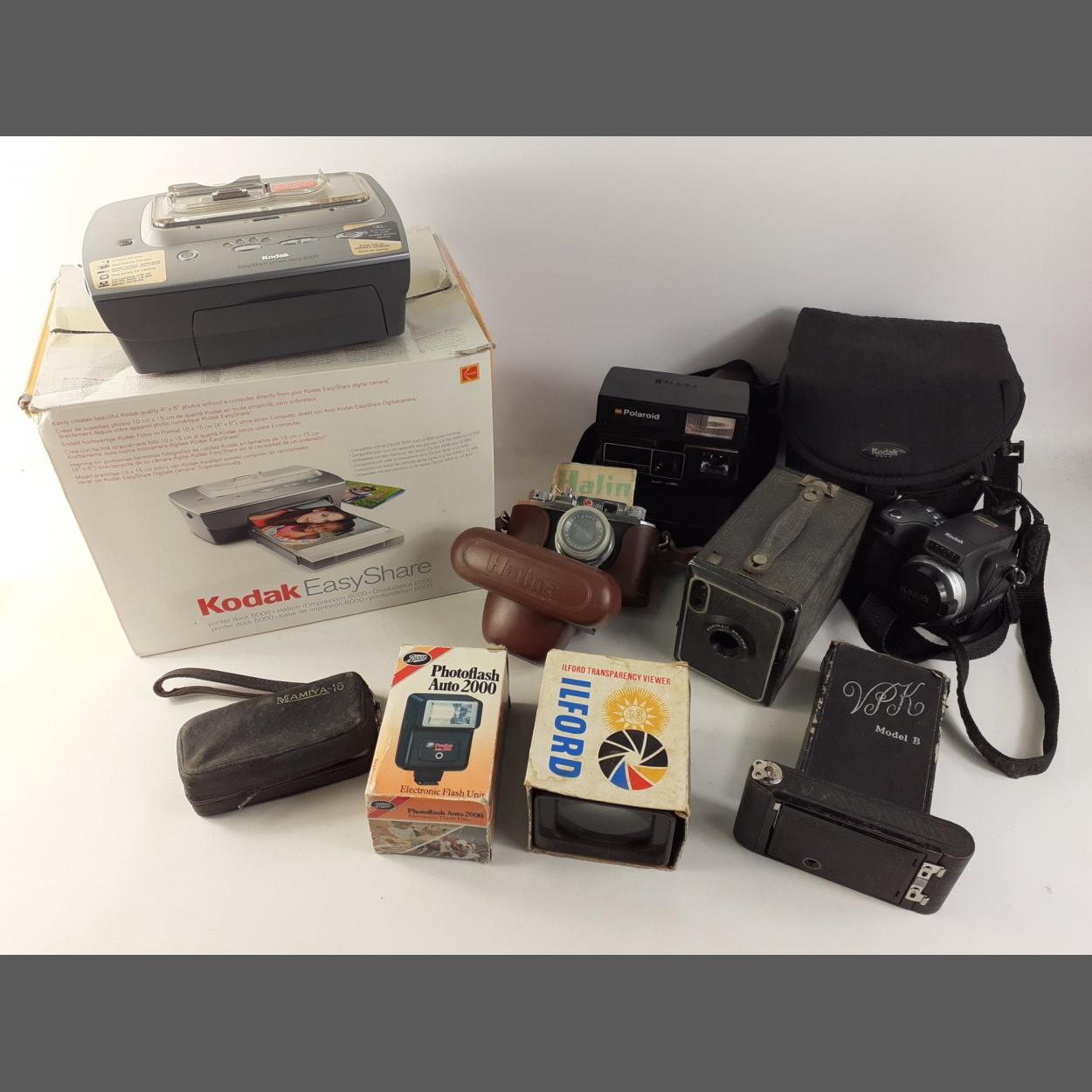 A mixed lot of cameras to include a KODAK 10x Optical Zoom (40 megapixels), a POLAROID Supercolor camera, a HALINA 35mm camera (Ref. No. 101/AC), a No.2 BOX BROWNIE camera, a KODAK EASYSHARE PHOTO PRINTER, A VPK Model B camera, an ILFORD TRANSPARENCY VIEWER, a MAMIYA-16 camera and a Boots PHOTOFLASH AUTO 2000.