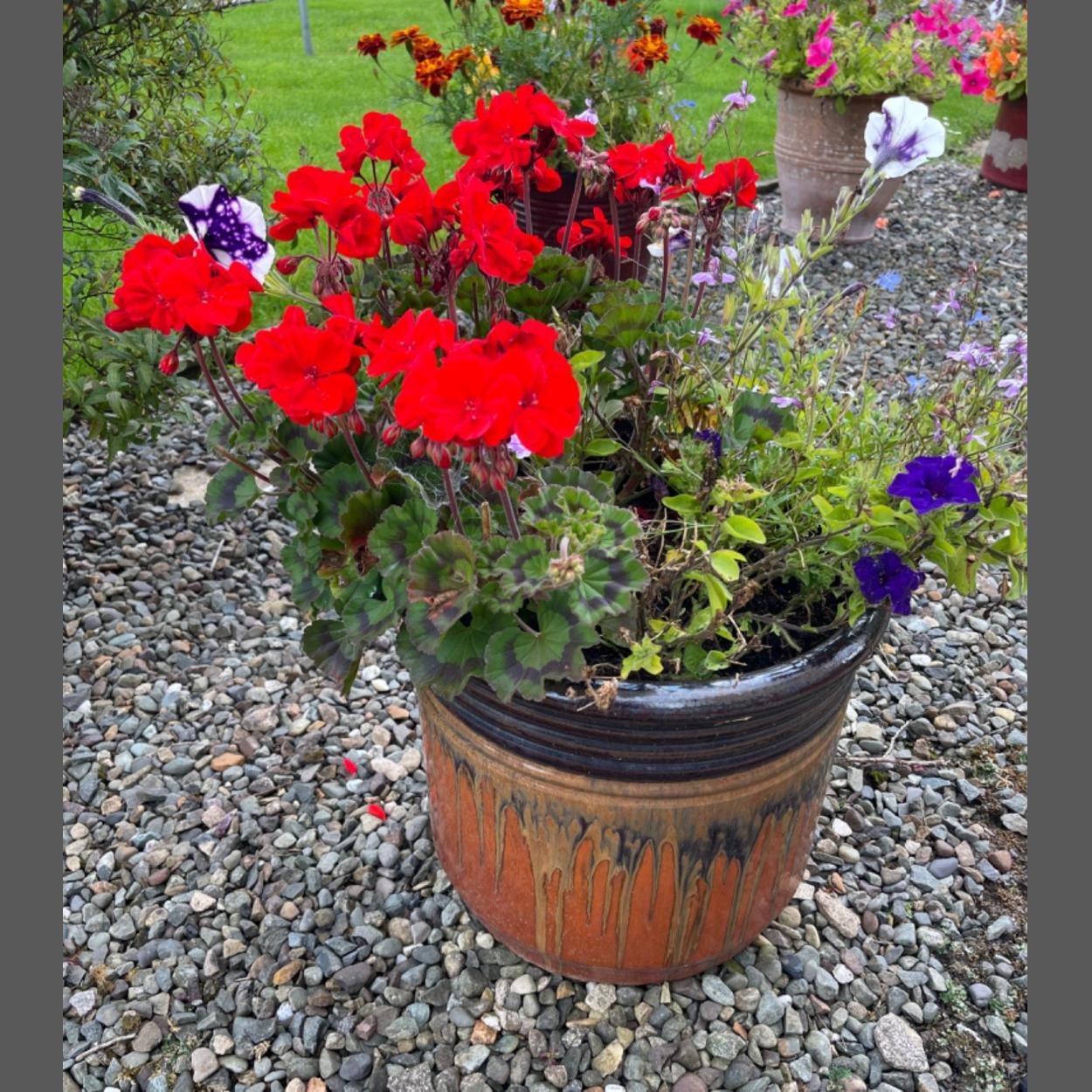 A DELIGHTFUL planted drip-glazed ceramic container to include red geranium and purple petunia summer planting - 35cm height approx