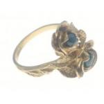 A 375 stamped gold ring with two blue stones in a floral design setting. Size L gross weight 4.4g approx