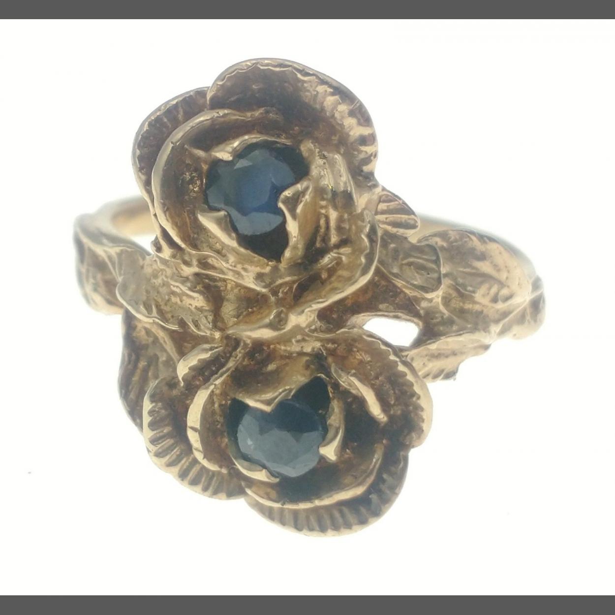 A 375 stamped gold ring with two blue stones in a floral design setting. Size L gross weight 4.4g approx
