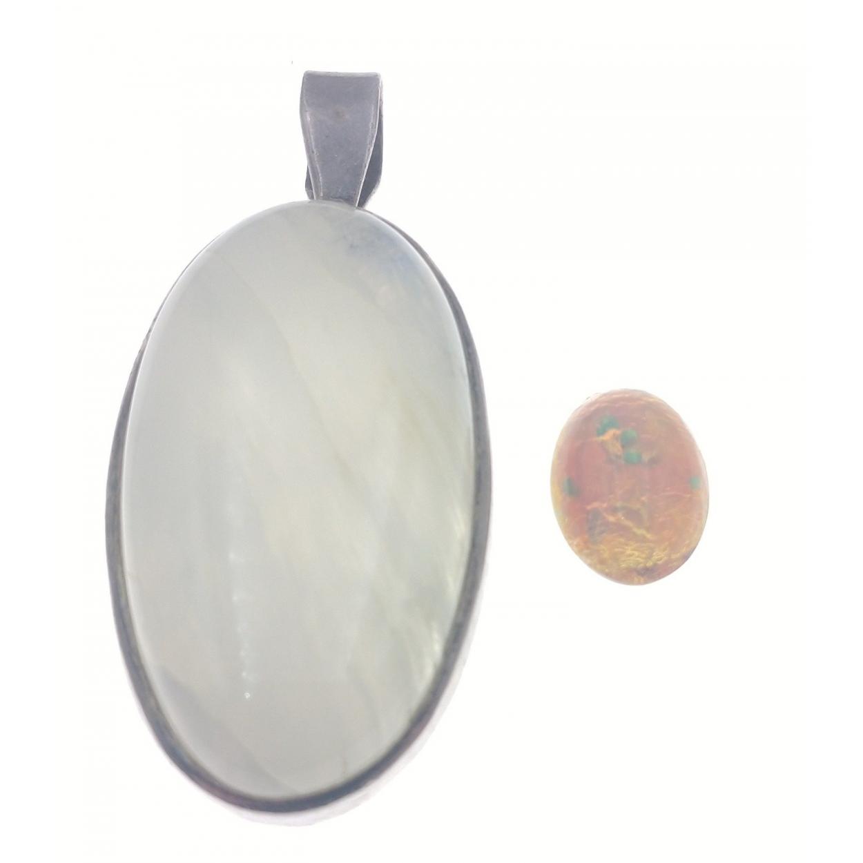 A silver mounted white stone pendant. Pendant is 7 x 3cm approx, gross weight 34g approx, also includes a small shaped opal