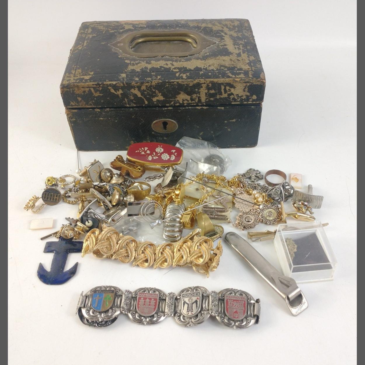 A lovely old leather covered cash style box containing a super lot of bracelets, earrings, studs, rings etc. A great lot !