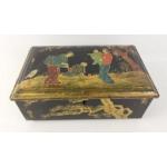 A vintage RILEYS toffee tin with oriental scene containing a quantity of pearls, beads and a three coloured string headpiece.