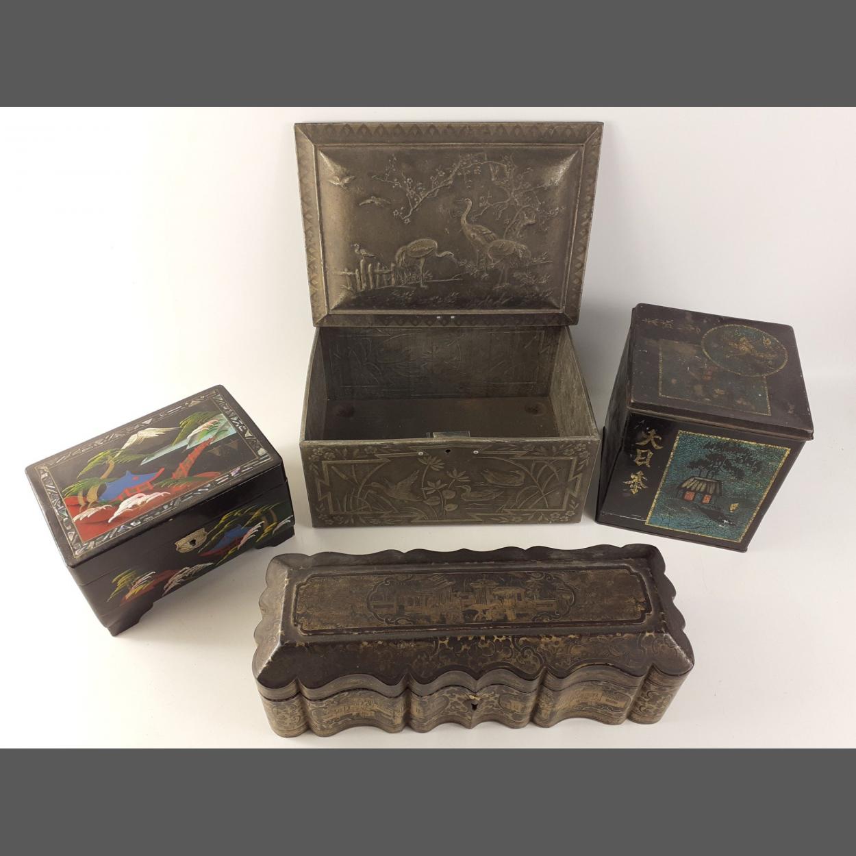A collection of four pretty oriental style tins and a lacquered inlaid box.