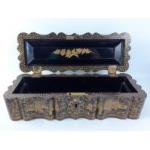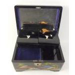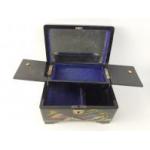 A collection of four pretty oriental style tins and a lacquered inlaid box.