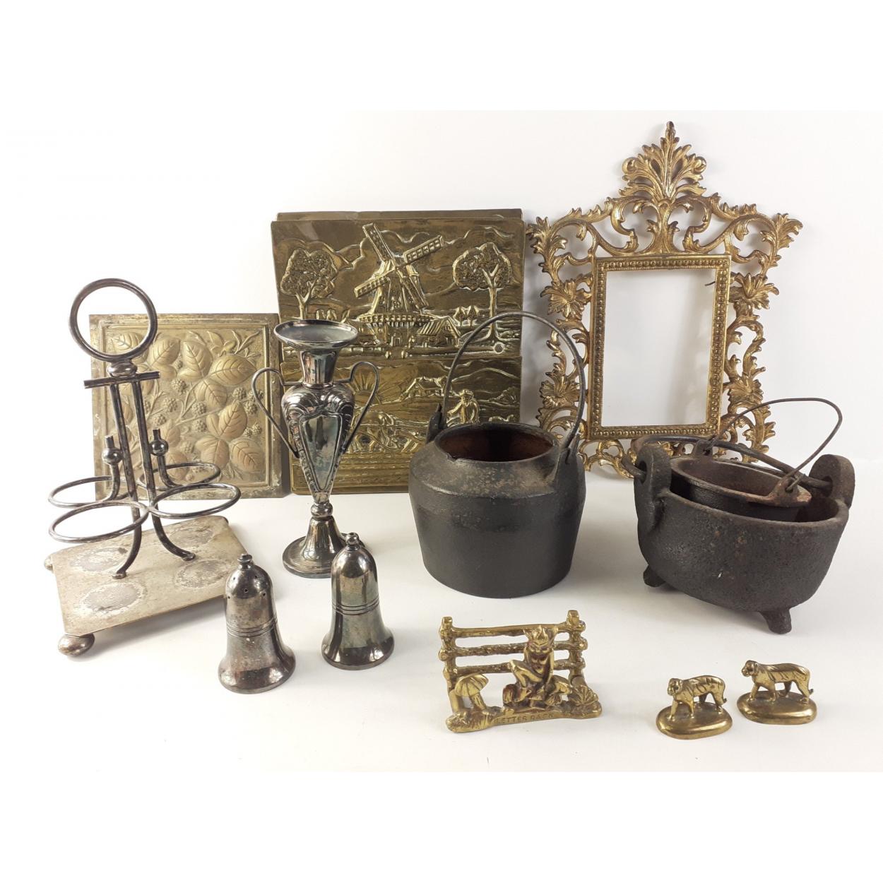A small collection of metalware and silver plated items to include an attractive EPNS posy vase, an EPNS condiment pair, an older plated condiment stand, some super old cast crucible style pots and some brassware.