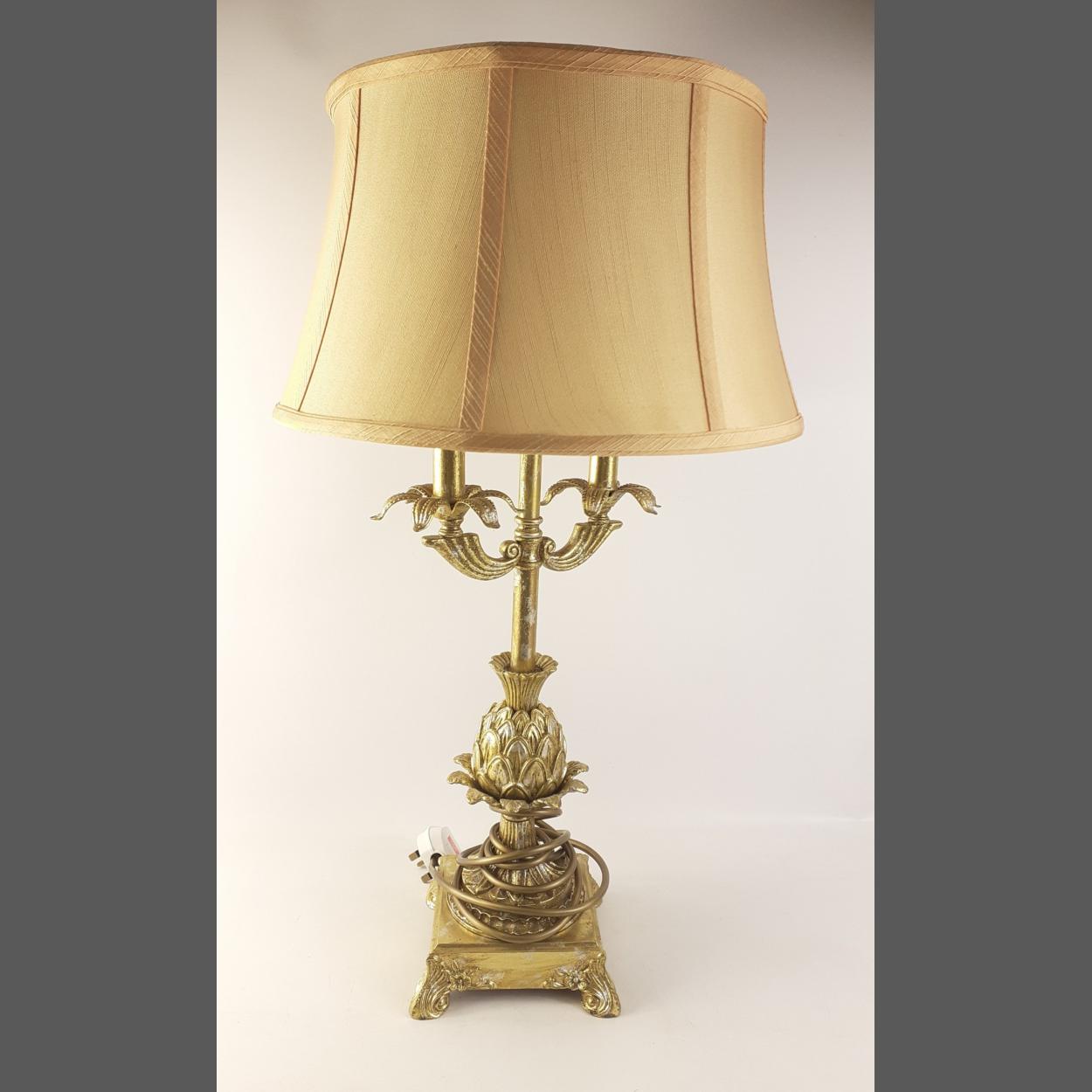 One of a pair of attractive gilt table lamps with cream shades. Base stems have pretty applied pineapples. Stands 64cm to the top of the shade.