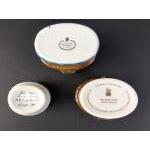 Three pretty enamel pill boxes, the largest by HALCYON DAYS, the blue one by THE ROYAL COLLECTION and the smallest by LIMOGES. All in good condition.