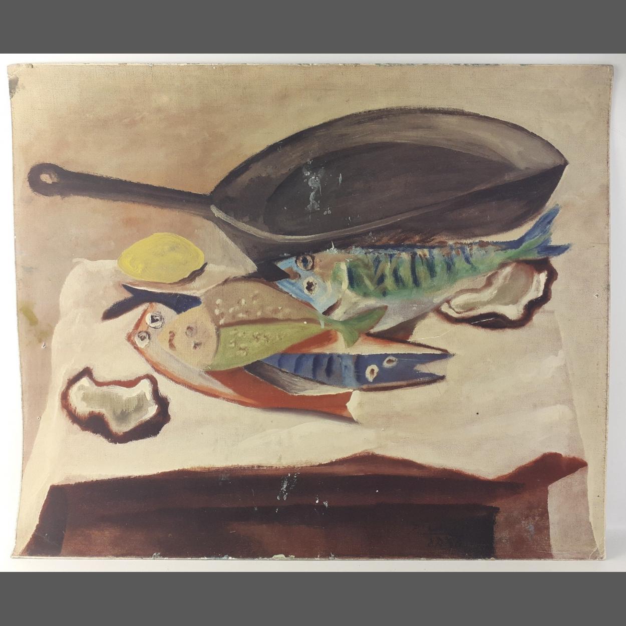 A VINTAGE 1936 print on card by Pablo Picasso 'Still Life With Fish' - 24" x 19.5" approx - the card print has a couple of pin-fixing holes top and bottom