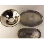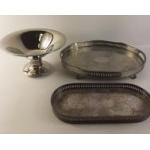 A nice selection of good quality silver plate comprising a 41cm silver plated on copper oval gallery tray, an oblong similar piece and a really rather stunning wide fluted bowl with pierced and glazed stem standing 16cm tall and 28cm wide. .