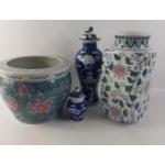 A nice little Oriental collection comprising a flower pot, 26cm vase and two small blue and white lidded vases.