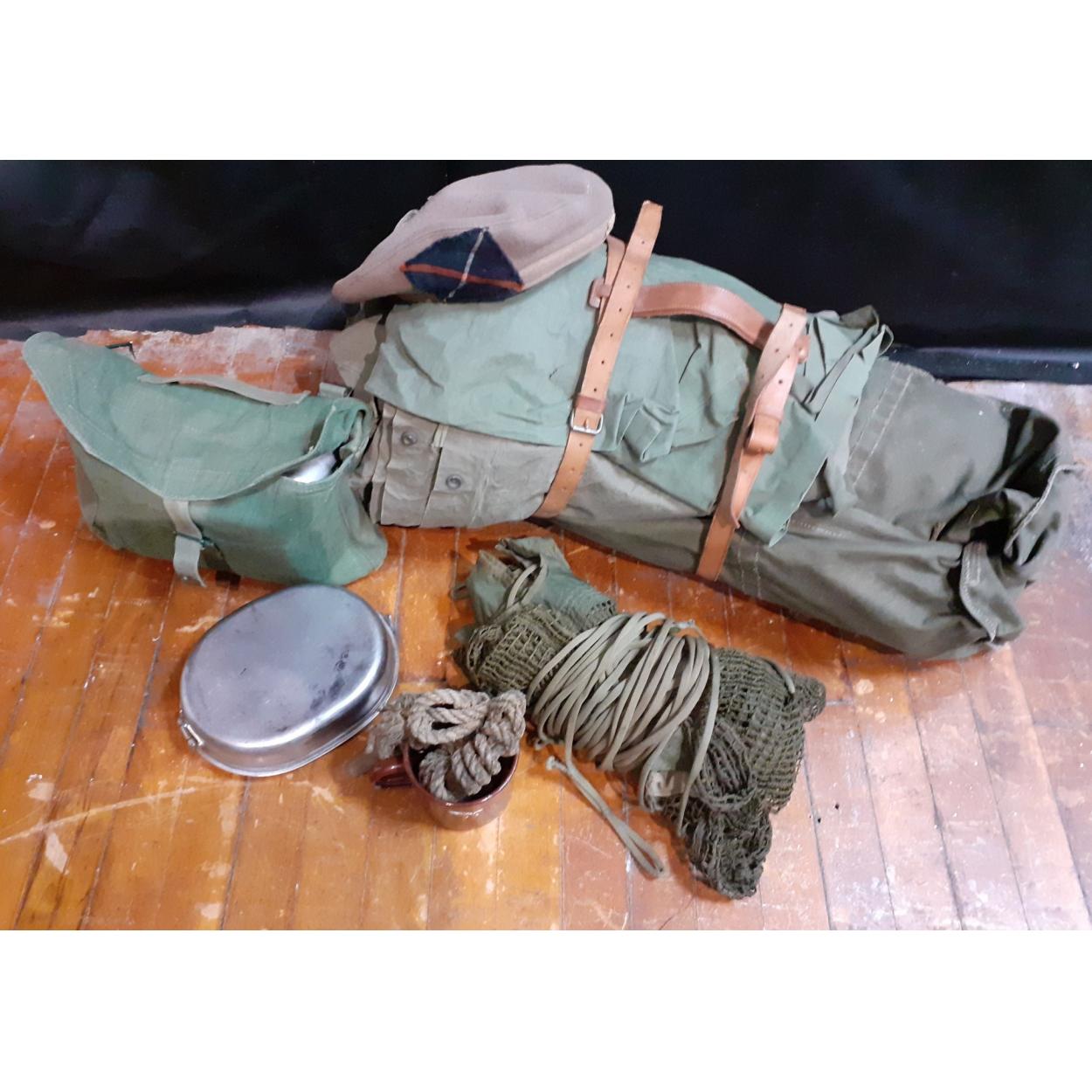 A national service sleeping hammock and camping equipment to include a mess tin, a water sterilizing kit and tin mug, an army vintage KOSB? cap made by Jardines & Sons of Edinburgh