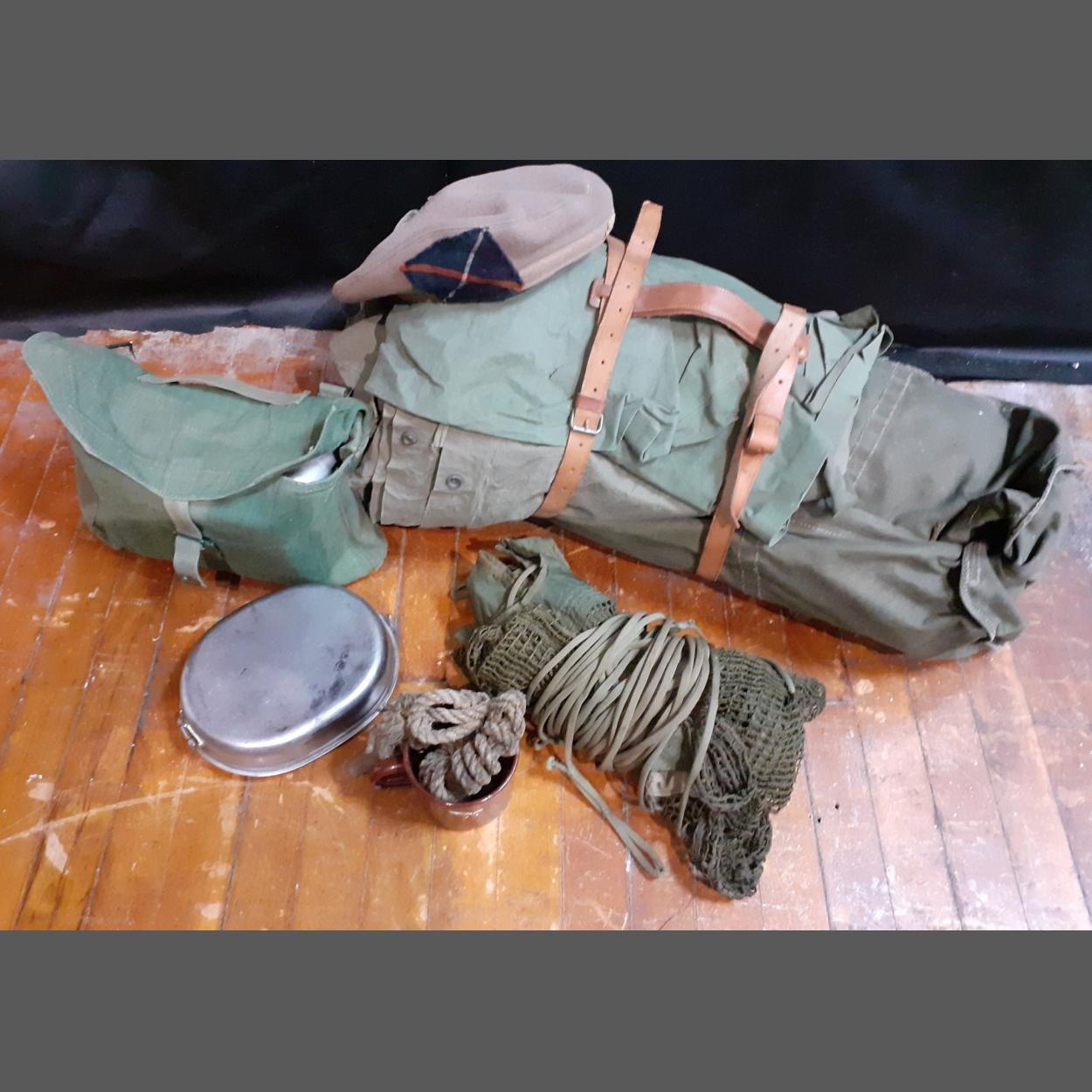 A national service sleeping hammock and camping equipment to include a mess tin, a water sterilizing kit and tin mug, an army vintage KOSB? cap made by Jardines & Sons of Edinburgh