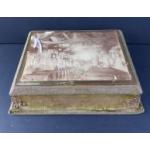 A MOST UNUSUAL shaped ecclesiastical jewellery box with brass FILLED with fascinating jewellery to include some unmarked yellow metal jewellery, a 'TINY' wee vintage snake-skin purse - dimensions 3.5cm x 2.5cm - also a nice piece of JADE in the form of traditional dress priest 5.5cm tall approx