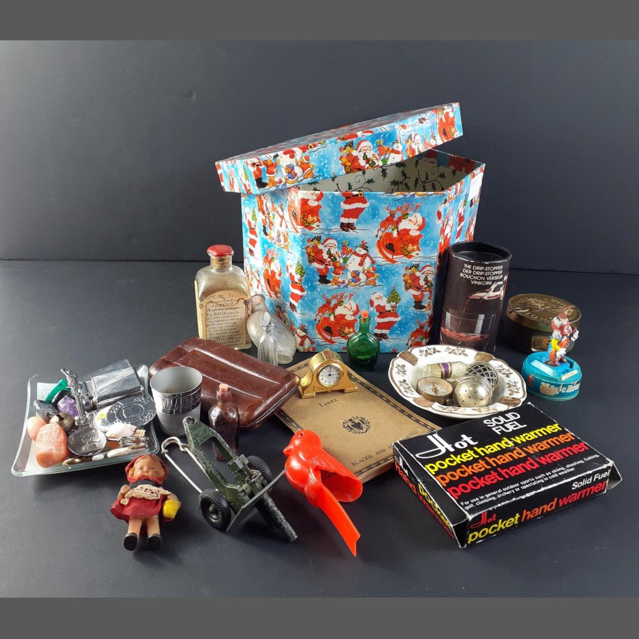 An hexagonal lidded box FILLED with curios to include a small brass mantle clock, a leather bound cigar case, a small LIMOGES plate, a small HOWITZER toy canon, polished stones of varying colours , lots of tiny perfume bottles, a VINTAGE wax sealed bottle with Bath Waters included, kilt pin, a MAGIC ROUNDABOUT DYLAN cereal box figure and so much more!