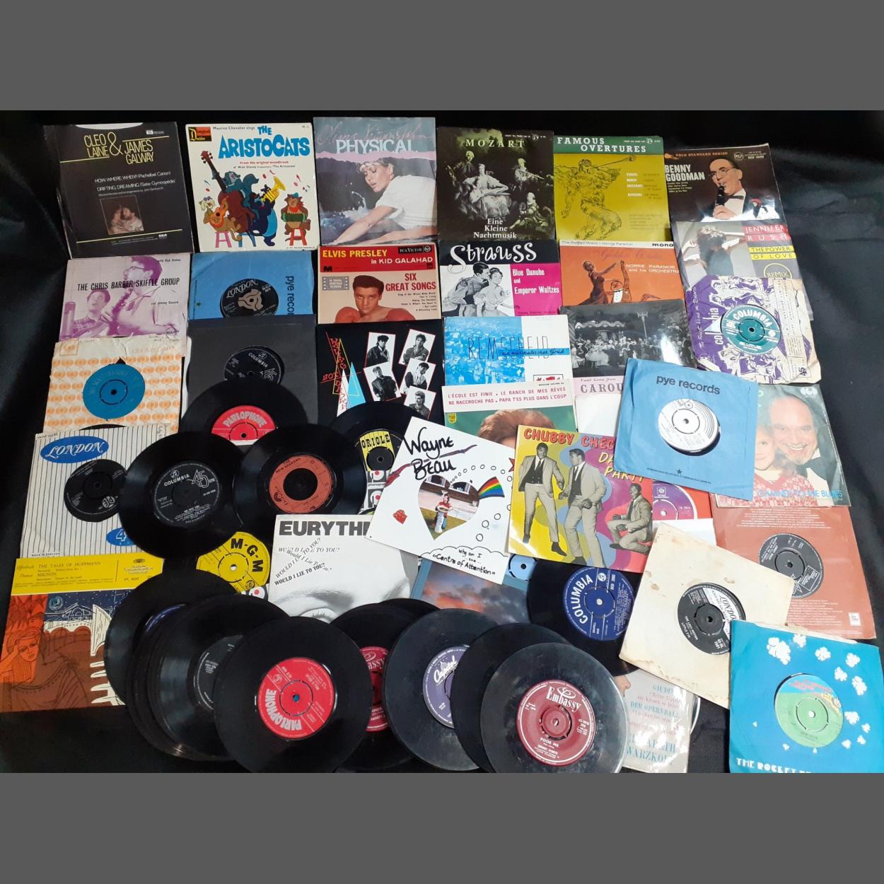 A box of 45rpm vinyl singles. Mostly 1960s / 1970s some with sleeves. A nice collection of over 70 records.