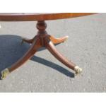 NICE QUALITY! A round wooden coffee table on quad brass claw wheels. Approx 91cm wide and 51cm tall