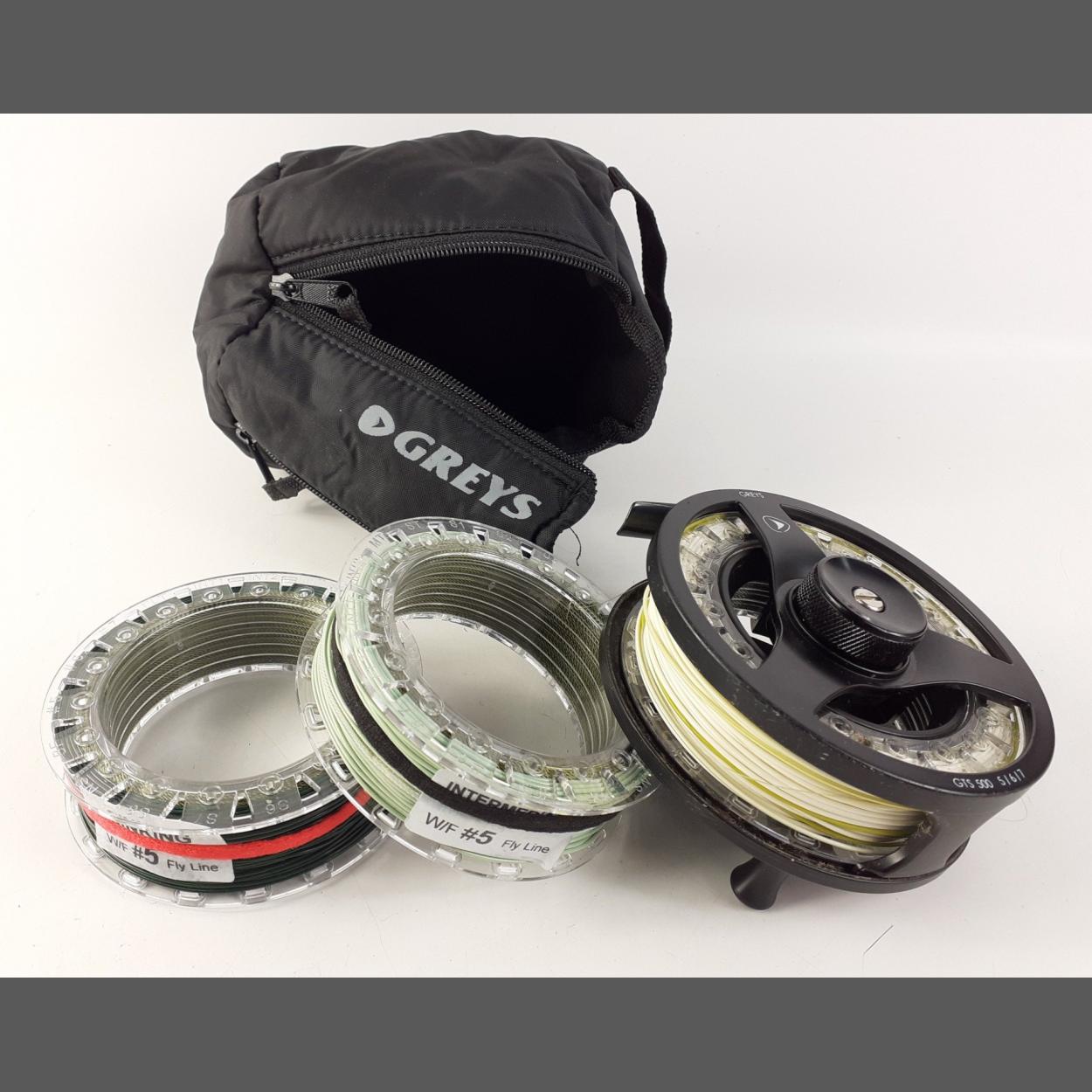 A GREYS GTS500 5/6/7 Fly fishing reel with two spare spools complete in a GREYS soft case.