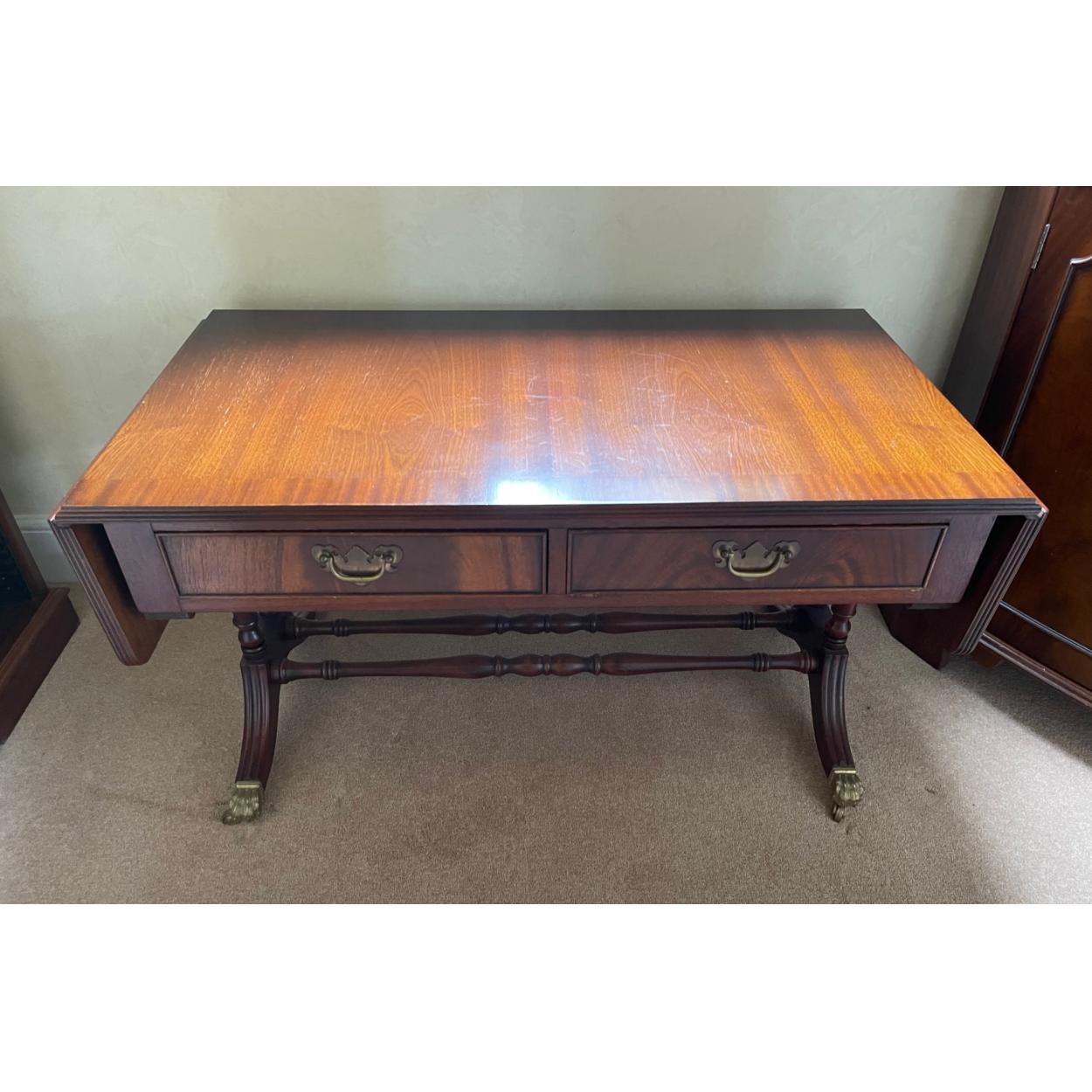 A nice quality mahogany GEORGIAN inspired low table with two hinged extension leaves and two drawers with brass handles and fittings - 3ft length(4ft when extended) x 18" depth approx