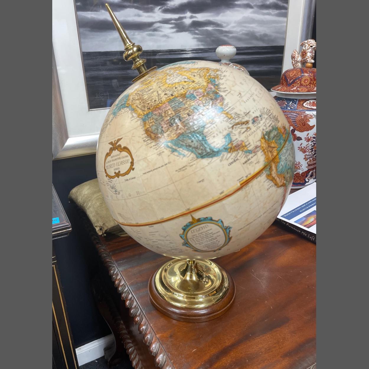 THE WORLD IS YOUR OYSTER - A WORLD GLOBE on a brass style stand - height 50cm x diameter 32cm approx