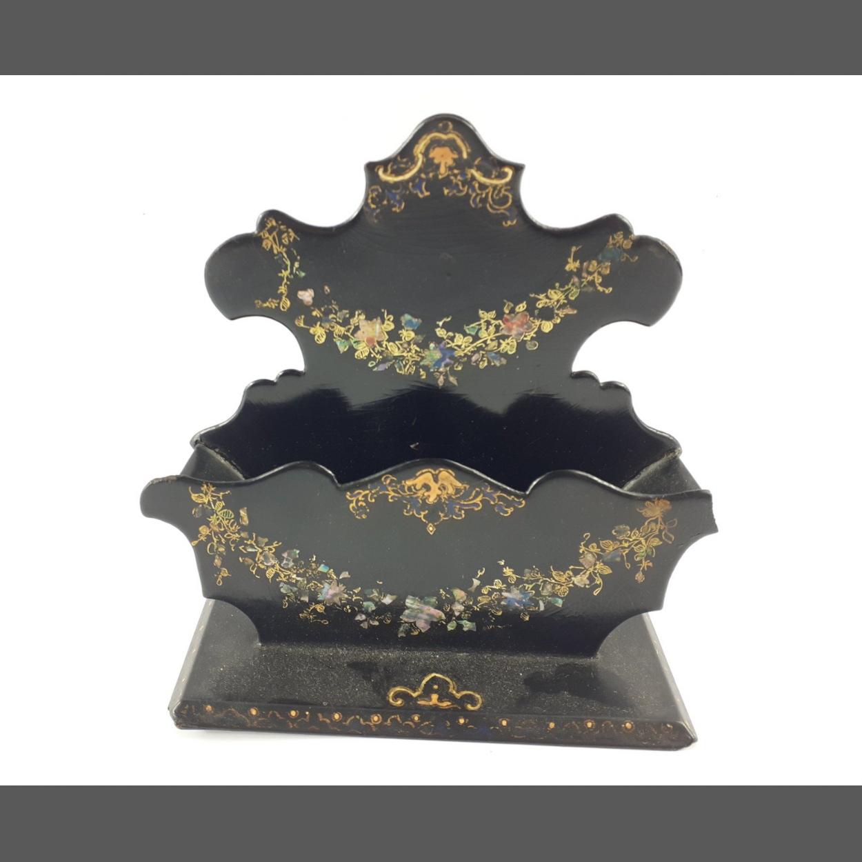 A gorgeous antique black laquer, gilt and inlaid small letter rack. A beautiful little rack in lovely conditio. Standing 18cm high approx.