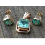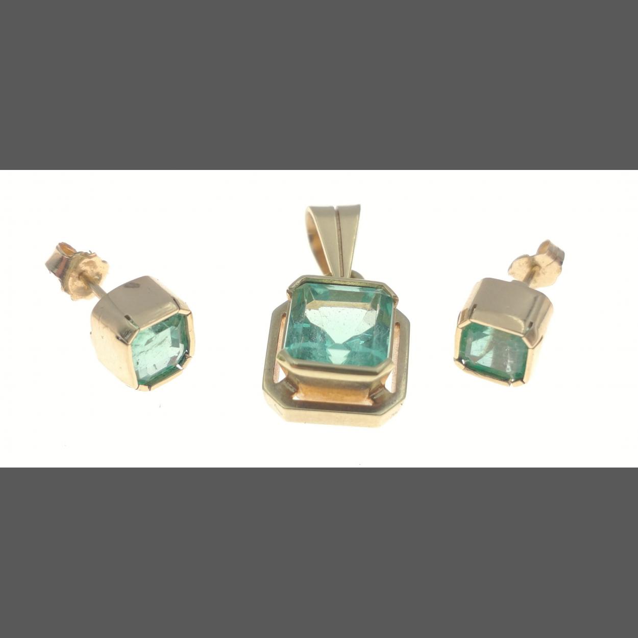 A striking Emerald pendant and pair of matching Emerald ear rings in 18ct gold mounts. With older valuation documentation from 2005 showing a combined Insurance Valuation from Chisholm Hunter of over £5000. On 2005 Valuation the pendant is noted as ''A single stone pendant set with pale cut emerald measuring approx. 9mm x 7.96mm x 6.2mm deep. Estimated emerald weight 3.26 metric carat with light inclusions. Mounting marked and testing as 18ct Gold'' The ear rings are noted as '' A pair of single stone stud earrings. Each set with a medium colouremerald, one measuring approx 6mm x 5.9mm and the other 6.3mm x 57mm. Estimated total emerald weight for pair 2.20 carat. Mounts tested as 18ct yellow gold. Very striking and impressive stones, a lovely set.